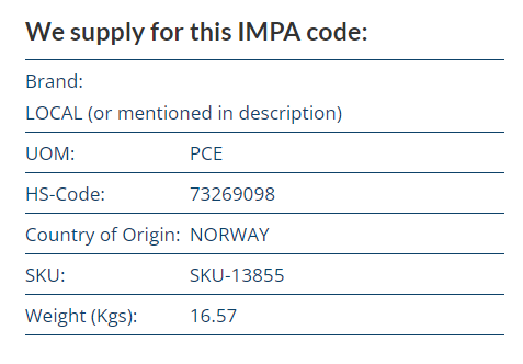 IMPA code number 211152 is available from stock and can be shipped out within 24/hrs to any agent or warehouse in the world. We have 15.000 different IMPA articles in out own stock and IMPA 211152-LINK MOORING TONSBERG 120T, WITH DNV CERTIFICATE is ready for shipping. Just order online, pay by different ways in a secure eviroment and we ship out your IMPA ( 211152 ) the same day!